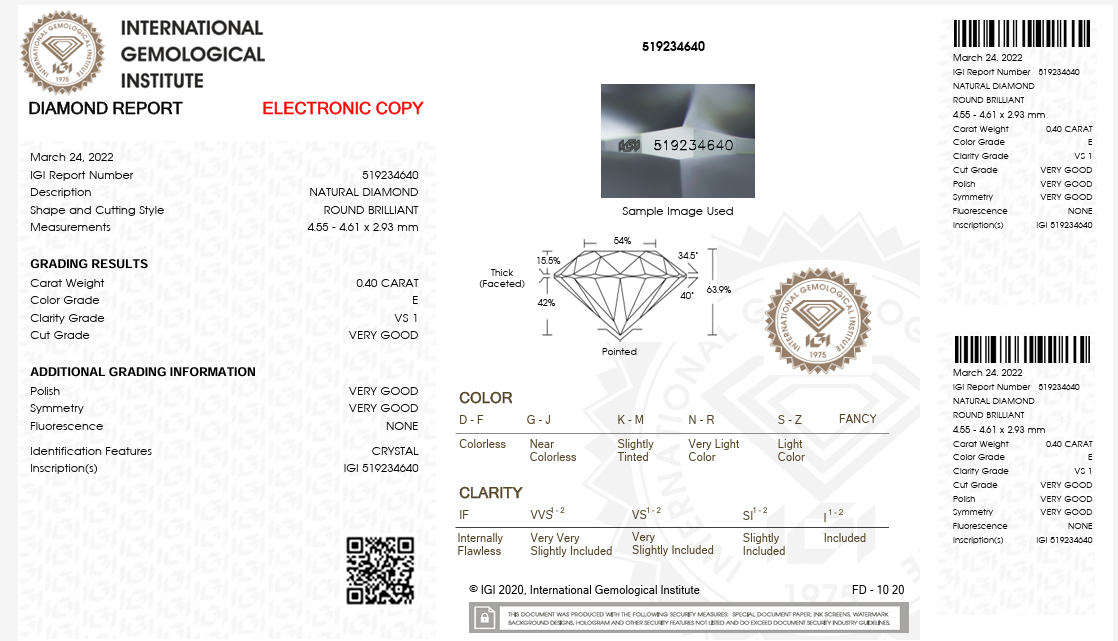 Il rapporto IGI sui diamanti naturali include la descrizione della pietra preziosa, nonché la sua forma, lo stile di taglio, le misure e le valutazioni delle 4C: peso in carati, colore, purezza e taglio.I report sui diamanti possono anche includere una rappresentazione grafica delle proporzioni del diamante, un diagramma delle sue caratteristiche di purezza e un commento sulla sua incisione laser, se presente.
