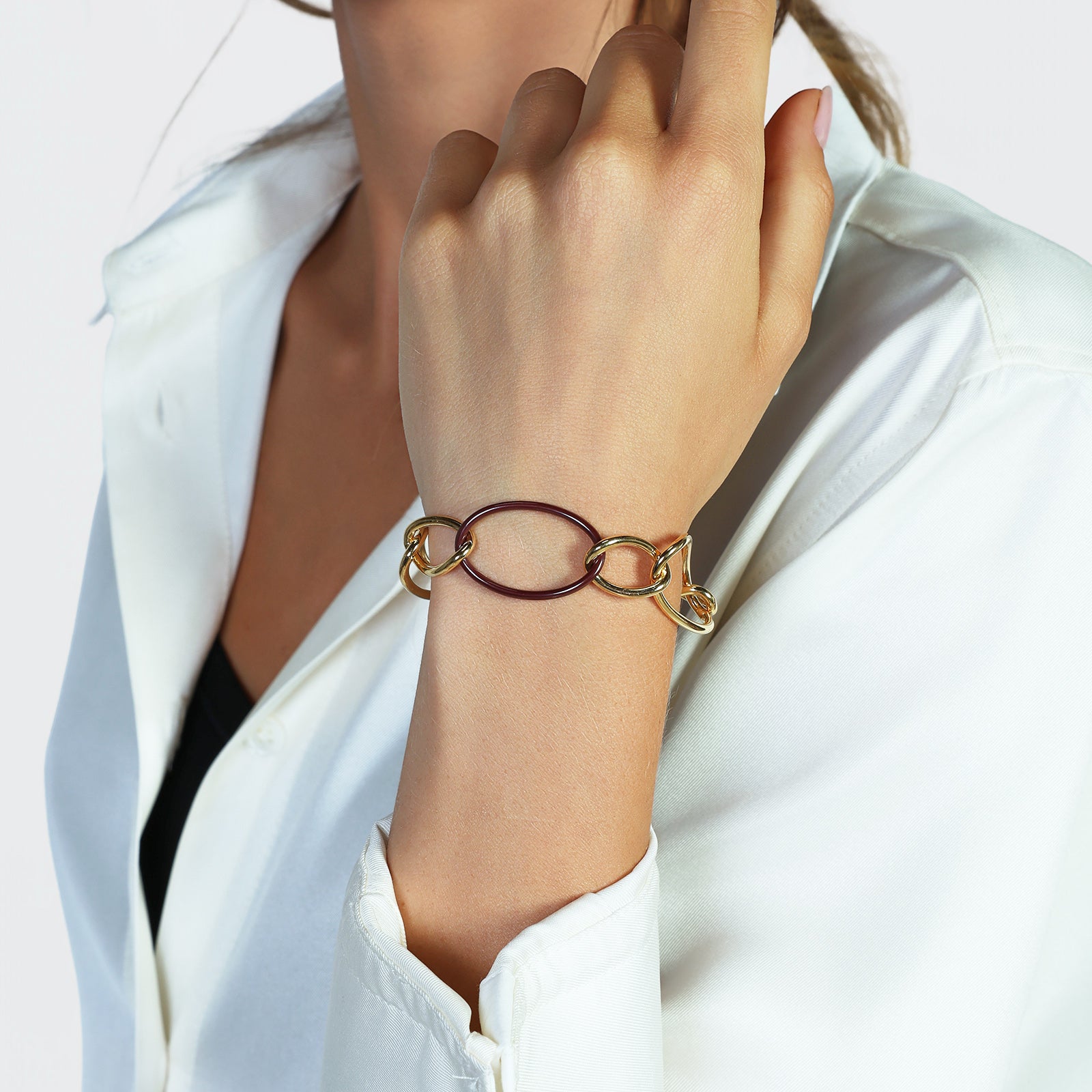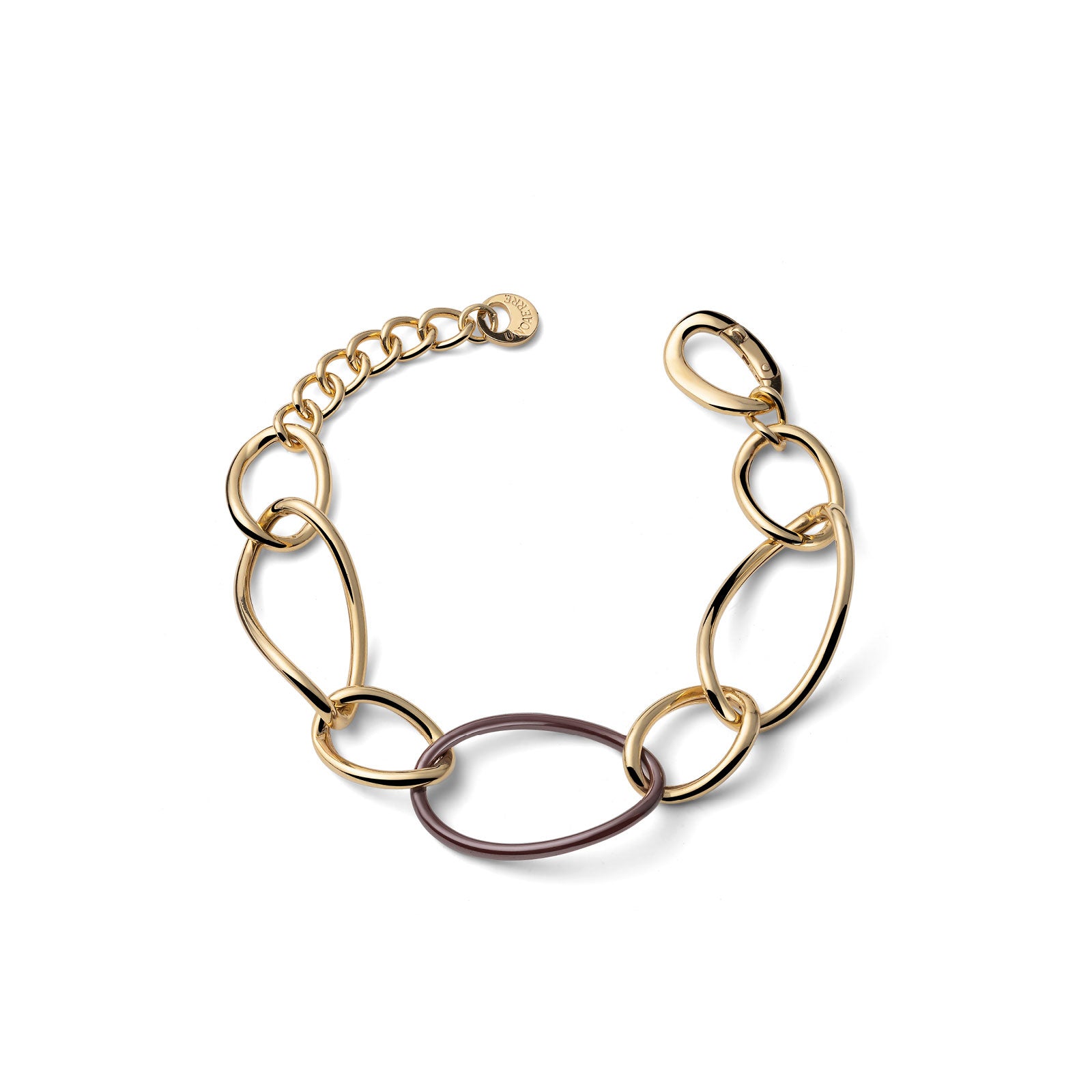 Bracciale in argento dorato, catena a maglie ovali e maglia in ceramica cioccolato. Lunghezza 16,50 + 3,00 cm. Un gioiello dalla linea elegante con un dettaglio unico ed originale, per un tocco di seduzione ad ogni tuo look. Scopri l'esclusiva collezione in argento Aria, dove leggerezza e minimal design sono le parole chiave per esaltare ed esprimere il tuo stile.