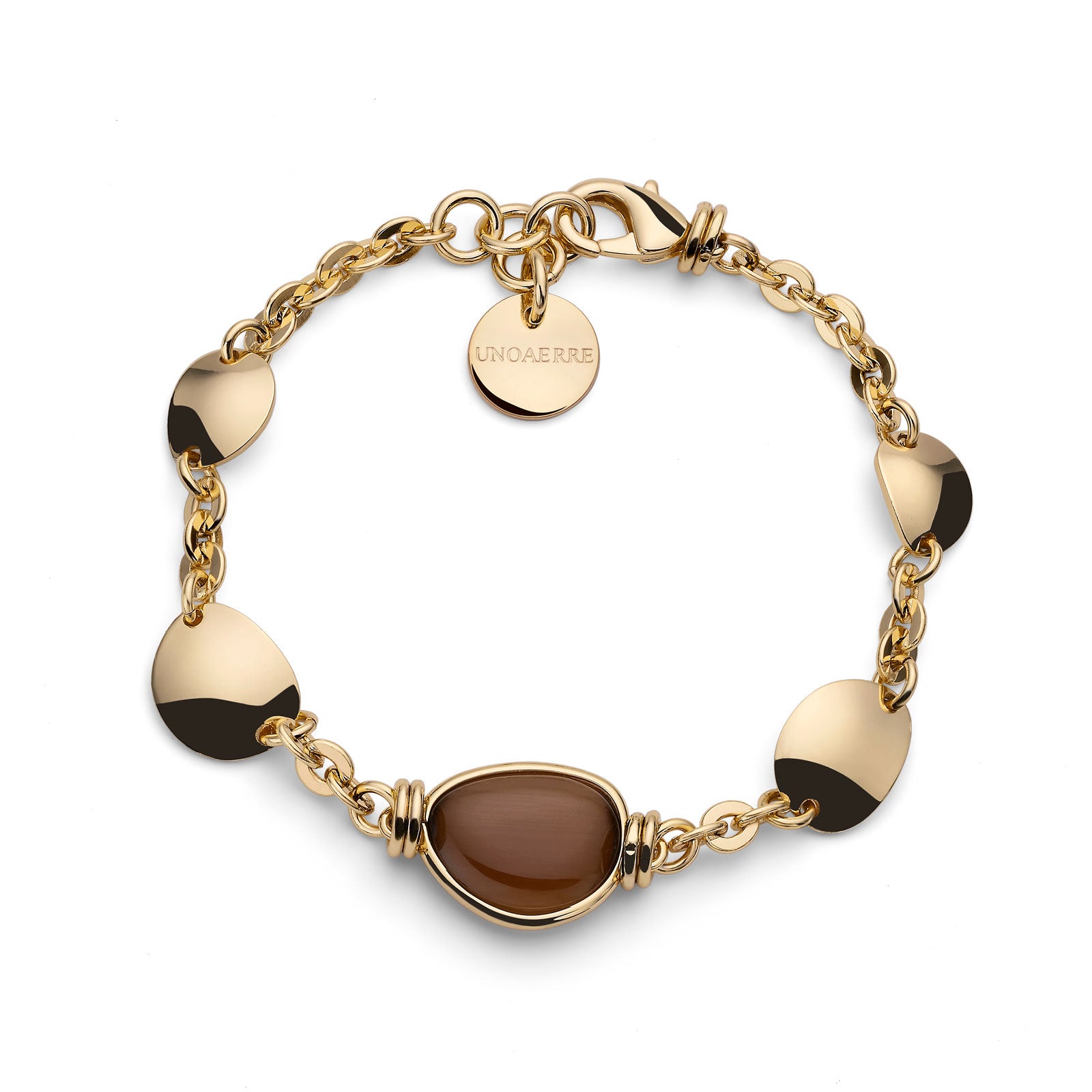 Bracciale in catena sottile dorata con elementi lisci e pietre occhio di gatto. Chiusura a moschettone, misura 19,00 cm. La linea sottile e luminosa della catena forzatina mette in risalto gli elementi lisci ed il colore intenso e sensuale delle pietre occhio di gatto che si alternano lungo il bracciale. Un gioiello dal design ipnotico ed iperfemminile per un tocco di magica energia in ogni occasione. Scopri il fascino gitano della collezione Gipsy e rendi unico il tuo stile.