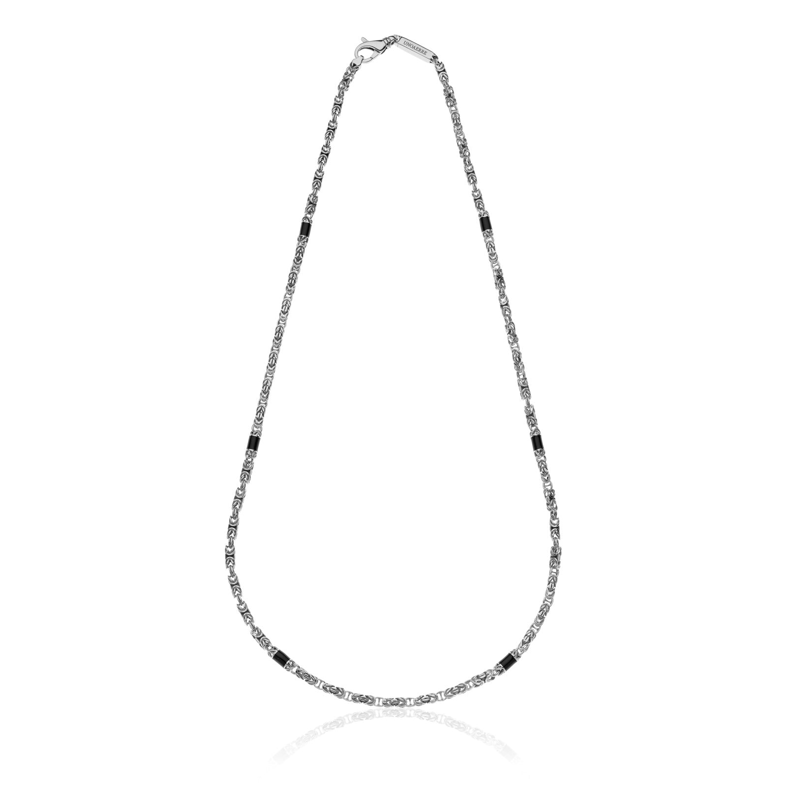 Collana uomo catena bizantina sottile in argento rodiato con dettagli in smalto nero. Chiusura a moschettone e logo UNOAERRE. Un grande classico del gioiello maschile reinterpretato in chiave moderna con finish rodiato e dettagli in smalto nero. Un tocco deciso per ogni tuo look. Misura 50,00 cm.