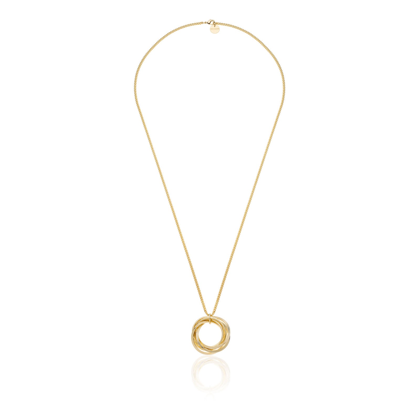 Collana lunga con pendente a cerchi intrecciati in finitura lucida e diamantata. Bagno in oro e chiusura a moschettone. Misura 81,00 cm. La squisita manifattura unita al design spiccatamente femminile di questa collana celebra il fascino classico ed intramontabile delle creazioni orafe firmate Unoaerre.