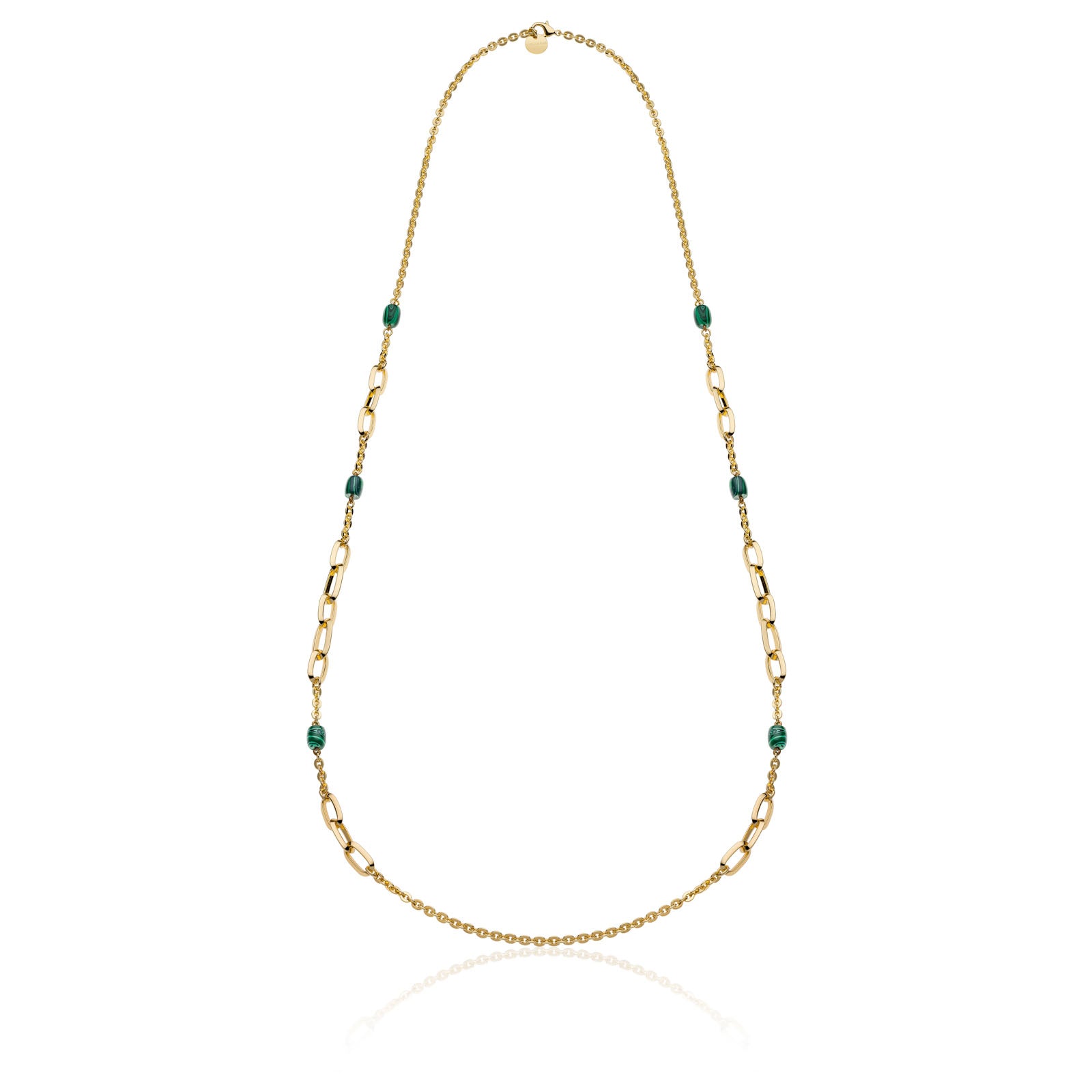 Collana lunga con catena forzatina fantasia, malachite verde e chiusura a moschettone. Lunghezza 113 cm. La catena fine e leggera è pensata per mettere in risalto il colore intenso degli elementi in malachite che si alternano lungo la collana. Un gioiello iperfemminile per conquistare al primo sguardo.