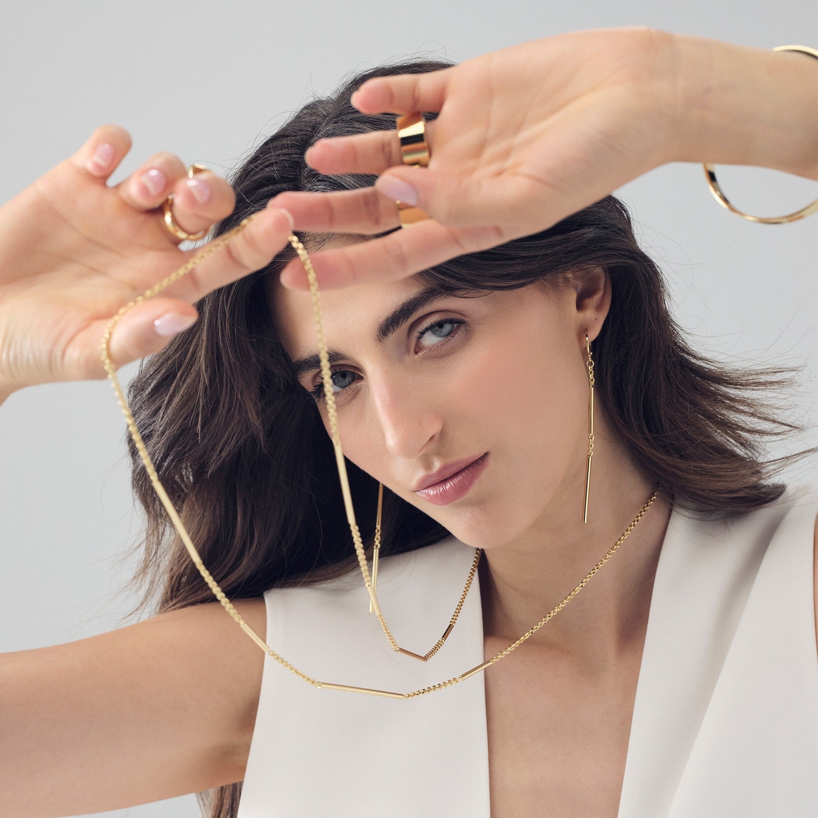 Collana lunga in catena forzatina fine alternata a barre tubolari, chiusura a moschettone, misura 120,00 cm. L'elemento classico a catena si alterna a barre tubolari per un insieme dal design pulito ed essenziale. Un raffinato gioco di contrasti tra curve morbide ed elementi rigidi, tra tradizione ed innovazione in cui il gioiello diventa chiave d'espressione di sé e del proprio stile.