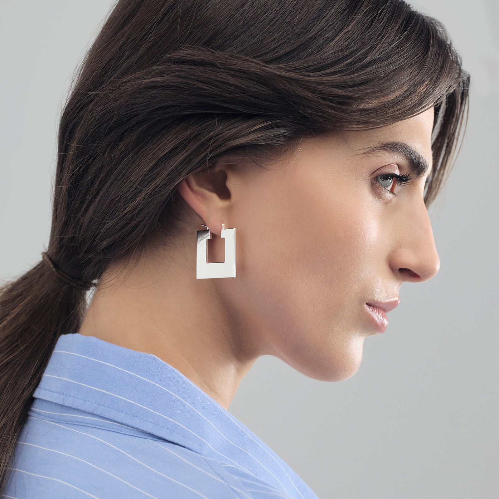 Orecchini a cerchietto piatto con forma geometrica quadrata. Chiusura a baionetta. Se ami distinguerti con particolari originali ed accessori dal design unico, non puoi lasciarti sfuggire questi fantastici cerchietti geometrici dell'iconica collezione Dinamica. Esprimi chi sei attraverso il loro stile unico e catturerai ogni sguardo.
