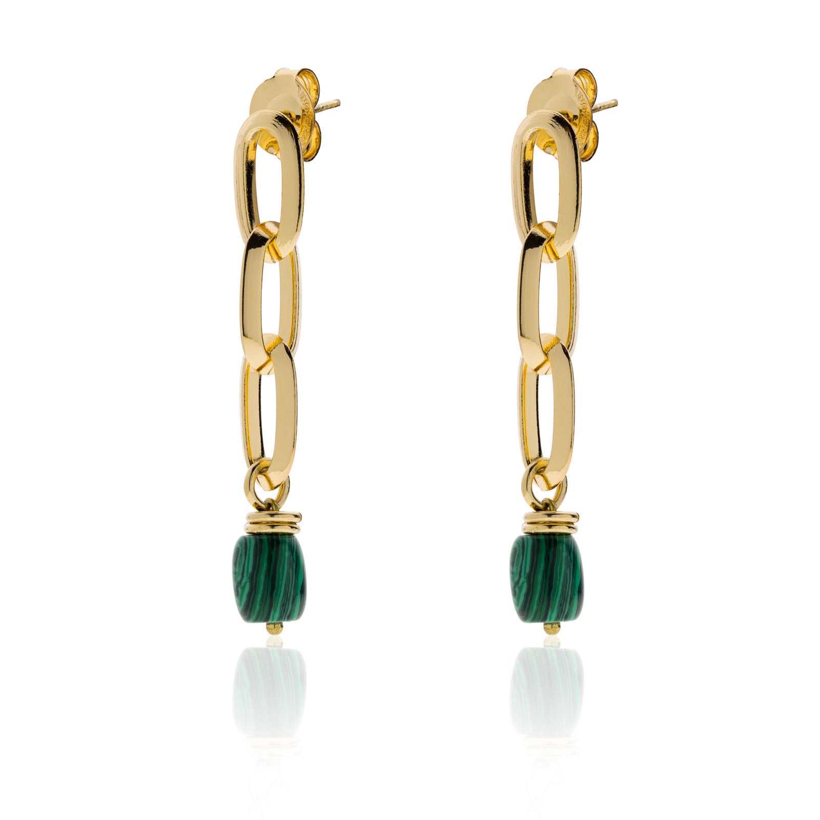 Orecchini lunghi con maglie di catena forzatina ovale e pendente in pietra malachite verde. Chiusura a perno e farfalla. L'intenso verde della malachite naturale viene messo in risalto dalla lucentezza della catena con bagno in oro. La magia delle pietre è assoluta protagonista e ti farà innamorare.