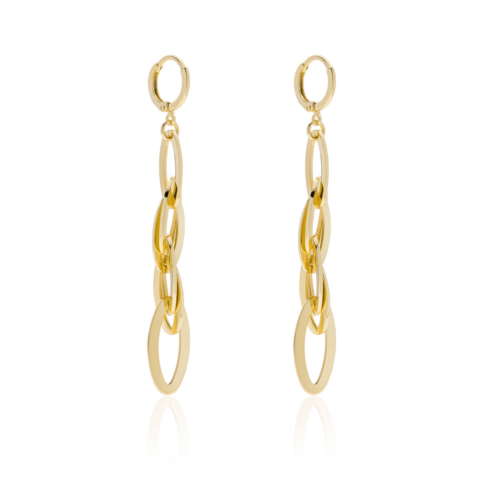 Orecchini pendenti catena a navette concatenata con bagno in oro giallo. Chiusura a monachella tonda. Lunghezza 6,50 cm. Il design audace, minimal di questi orecchini colpisce e cattura lo sguardo. Unica vera protagonista è la catena nella sua infinita, incredibile versatilità.