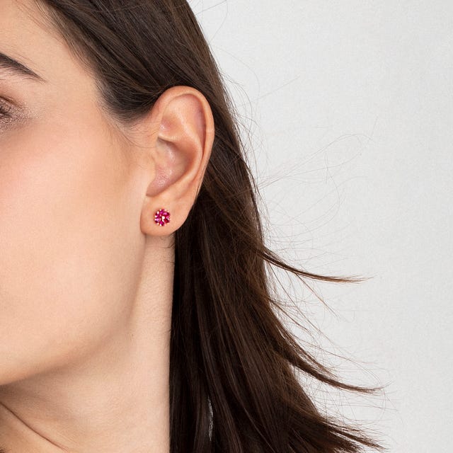 Orecchini in Argento 925 con rivestimento superficiale in Oro Rosa con Cubic Zirconia Rossi. Misura Fiore 0,7x0,7 cm. Made in PRC. Un tocco di colore ad in look elegante.